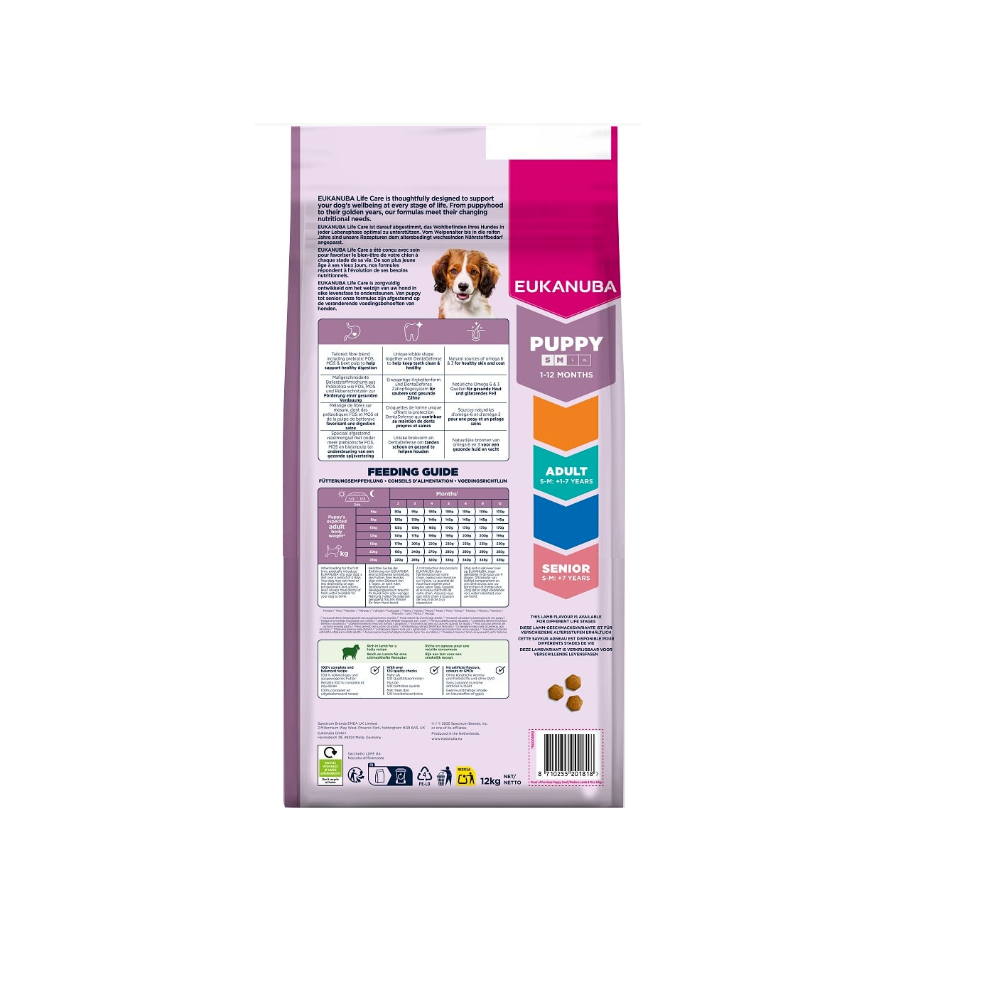 Eukanuba Puppy Small & Medium Breeds Lamb & Rice este o hrană uscată premium, completă și echilibrată, creată special pentru a susține dezvoltarea sănătoasă a cățeilor de talie mică și medie (sub 25 kg), în primul an de viață. Formula este concepută pentru a oferi nutriția optimă necesară unei creșteri armonioase, vitalitatei zilnice și unei imunități puternice.