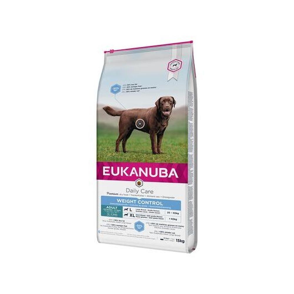 **EUKANUBA Daily Care Weight Control Large Adult Dog** este o hrană completă, adaptată pentru câinii adulți de **rasă mare (1,5-6 ani)** și **rasă gigant (2-5 ani)** care au tendința de a se îngrășa. Această formulă este concepută pentru a facilita menținerea greutății ideale, având un **conținut cu 30% mai puțină grăsime** decât hrana obișnuită Eukanuba Adult.