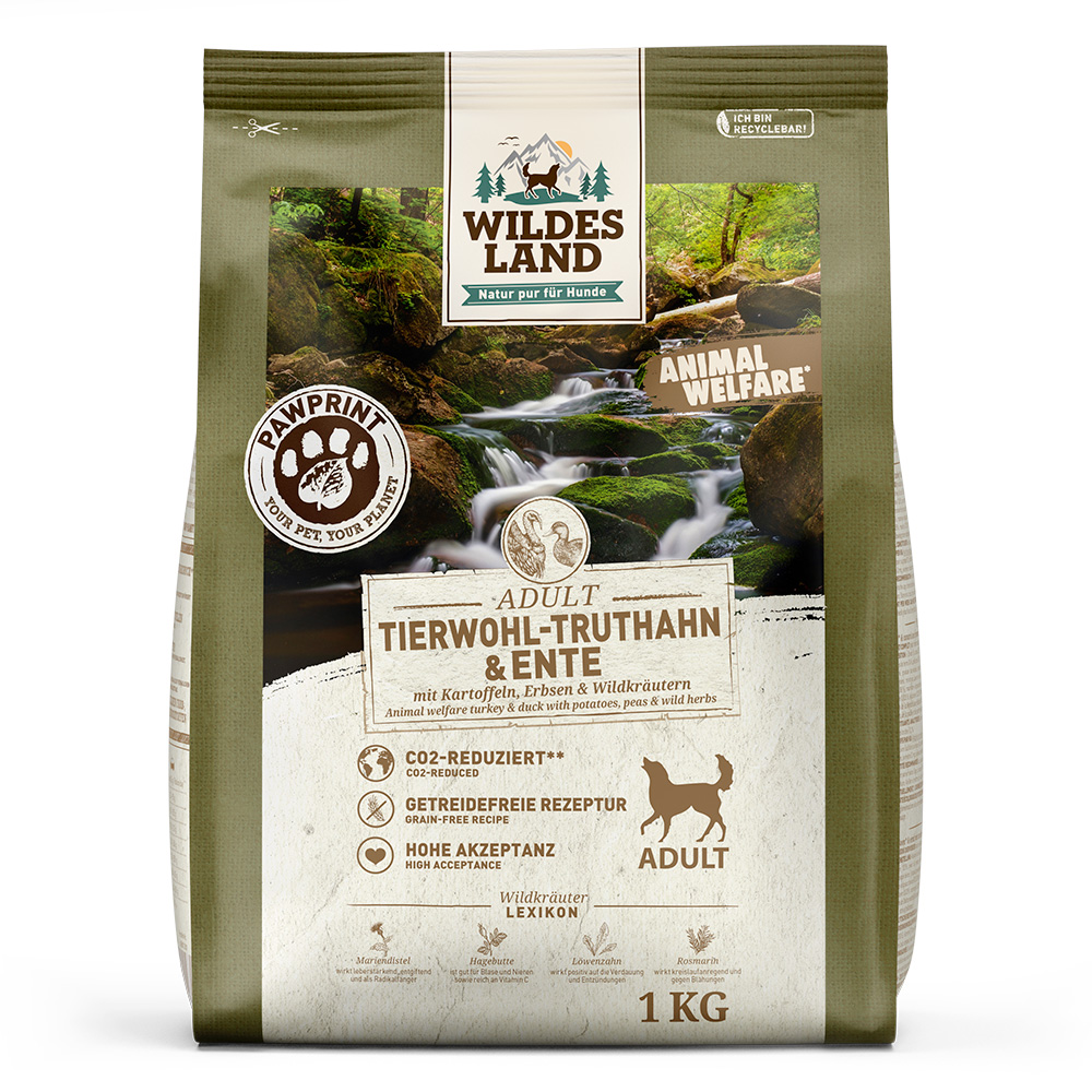 Wildes Land PawPrint Curcan & Rață este o hrană uscată completă și echilibrată, dezvoltată sustenabil și adaptată nevoilor câinilor adulți. Rețeta conține carne de curcan pentru bunăstarea animalelor, rață gustoasă, legume și ierburi sălbatice – o combinație nutritivă, ușor digerabilă și bogată în proteine naturale.